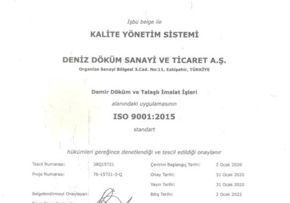 Deniz Döküm Sanayi ve Ticaret A.Ş. Organize Sanayi Bölgesi 3. Cad. No:11 Eskişehir/TÜRKİYE